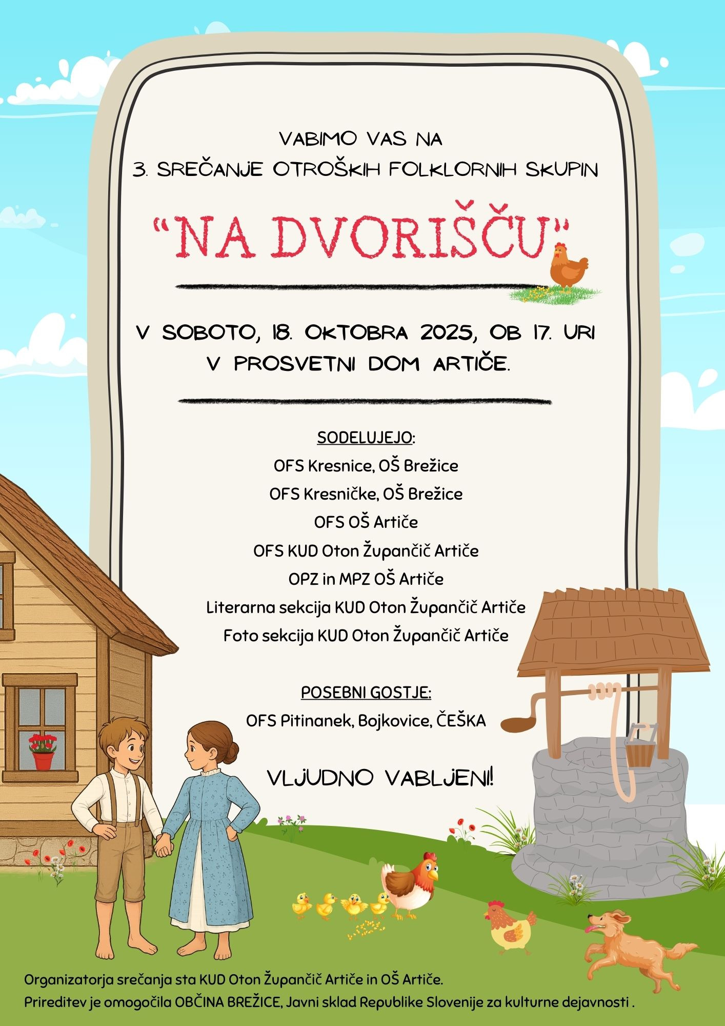 3. srečanje otroških folklornih skupin v ArtičahDatum: sobota, 18. oktober 2025Čas: 17.00Organizator: KUD Oton Župančič Artiče in OŠ Artiče